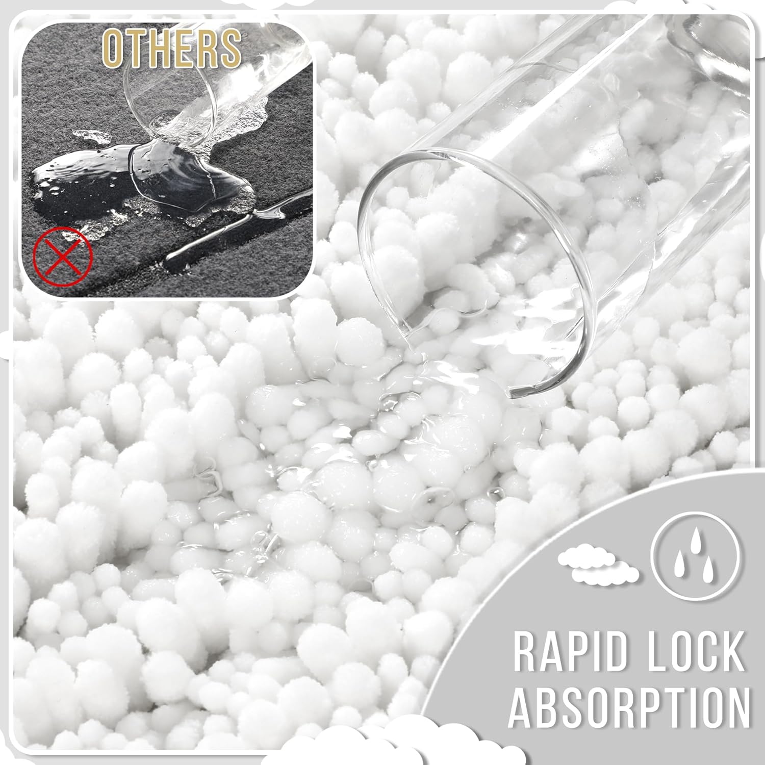 - Massive Water Absorption in Seconds: 5X faster than other materials mats, Yimobra bath mat absorbs 1000ml of water in 3 seconds. The vertical fiber channels lock moisture away from the surface, keeping your bathroom floor dry and discouraging damp environments. Perfect as a shower exit guard or sink splash catcher