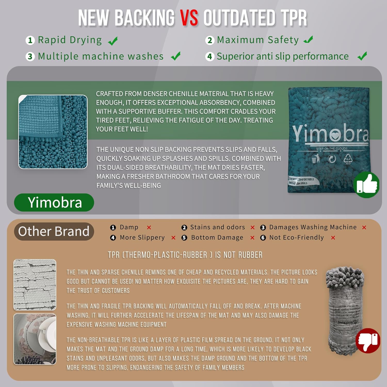 - Total Grip Safety & Quick Dry: Yimobra bath rug features a feather-light yet ultra-grippy hot-melt backing that stays firmly in place on wet surfaces. Its vertical air-channel chenille fibers ensure rapid and complete dryness, providing instant dry safety the moment you step out of the shower. The product is tested for harmful substances, performance, longevity, and emissions in accordance with the OEKO-TEX Standard 100
