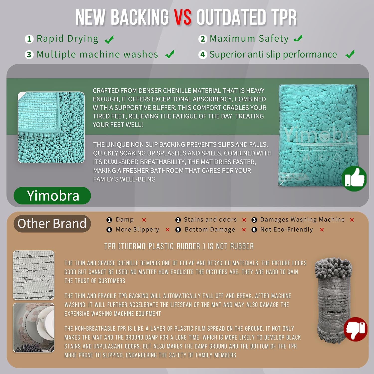 - Total Grip Safety & Quick Dry: Yimobra bath rug features a feather-light yet ultra-grippy hot-melt backing that stays firmly in place on wet surfaces. Its vertical air-channel chenille fibers ensure rapid and complete dryness, providing instant dry safety the moment you step out of the shower. The product is tested for harmful substances, performance, longevity, and emissions in accordance with the OEKO-TEX Standard 100