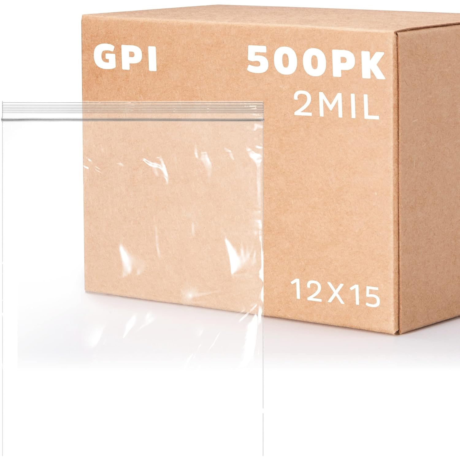 GPI Pack of 500, 12" X 15" Clear Plastic Reclosable Zip Bags - Bulk 2 Mil Thick Strong & Durable Poly Baggies with Resealable Zip Top Lock for Travel, Storage, Packaging & Shipping