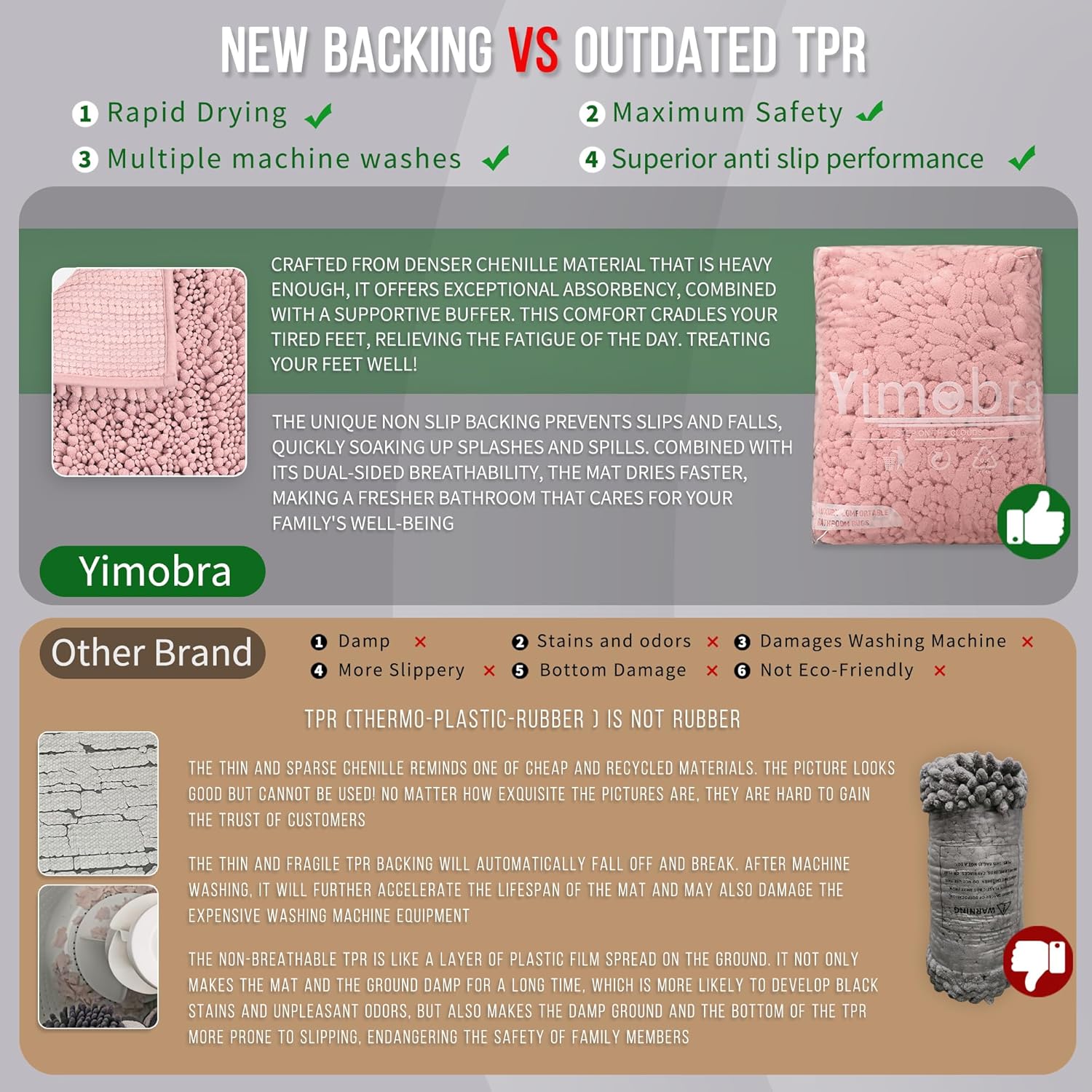 - Total Grip Safety & Quick Dry: Yimobra bath rug features a feather-light yet ultra-grippy hot-melt backing that stays firmly in place on wet surfaces. Its vertical air-channel chenille fibers ensure rapid and complete dryness, providing instant dry safety the moment you step out of the shower. The product is tested for harmful substances, performance, longevity, and emissions in accordance with the OEKO-TEX Standard 100