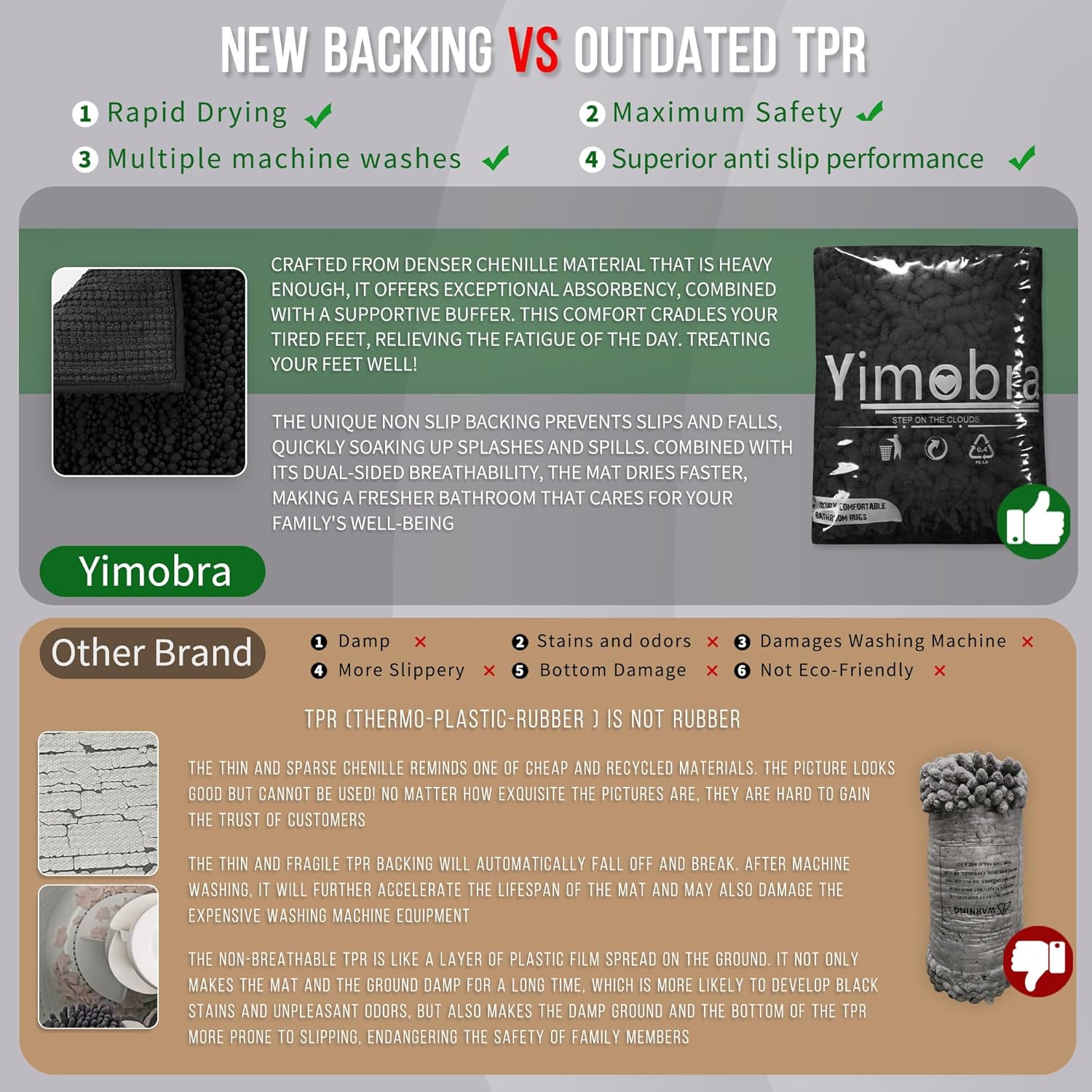 - Total Grip Safety & Quick Dry: Yimobra bath rug features a feather-light yet ultra-grippy hot-melt backing that stays firmly in place on wet surfaces. Its vertical air-channel chenille fibers ensure rapid and complete dryness, providing instant dry safety the moment you step out of the shower. The product is tested for harmful substances, performance, longevity, and emissions in accordance with the OEKO-TEX Standard 100