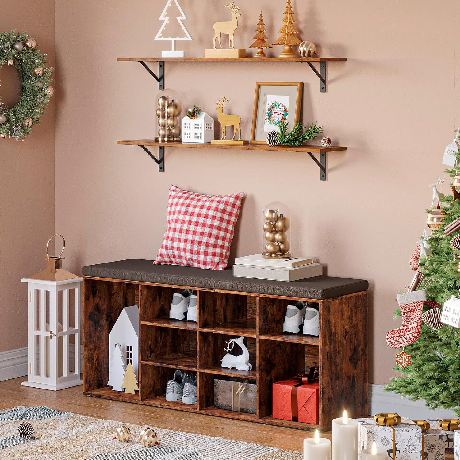 - 【Easy to Assemble】Easy-to-read instructions give you a step-by-step guide. Accompanying tools and numbered accessories make installation quick and easy. The diagonal bar of the rustic shelf will not hinder the installation, every hole can be easily reached by drills