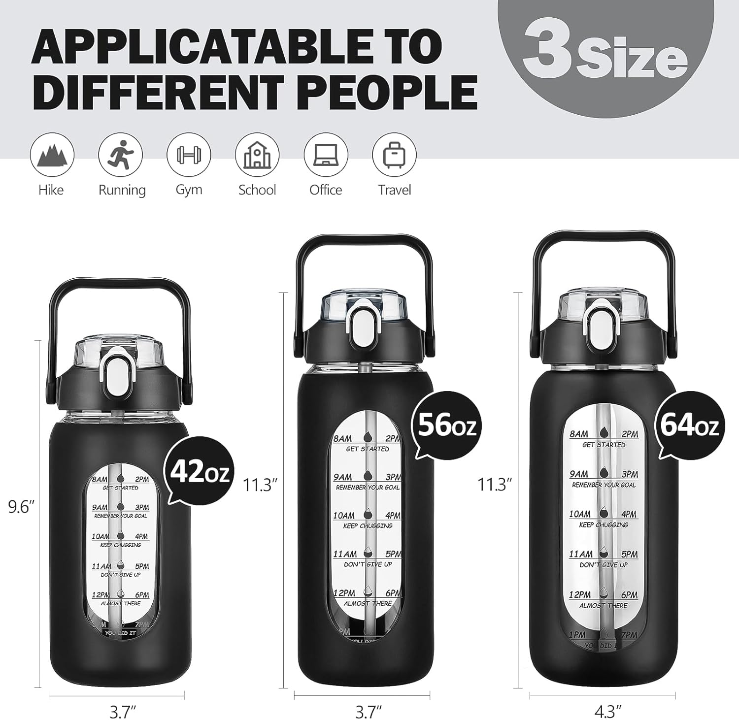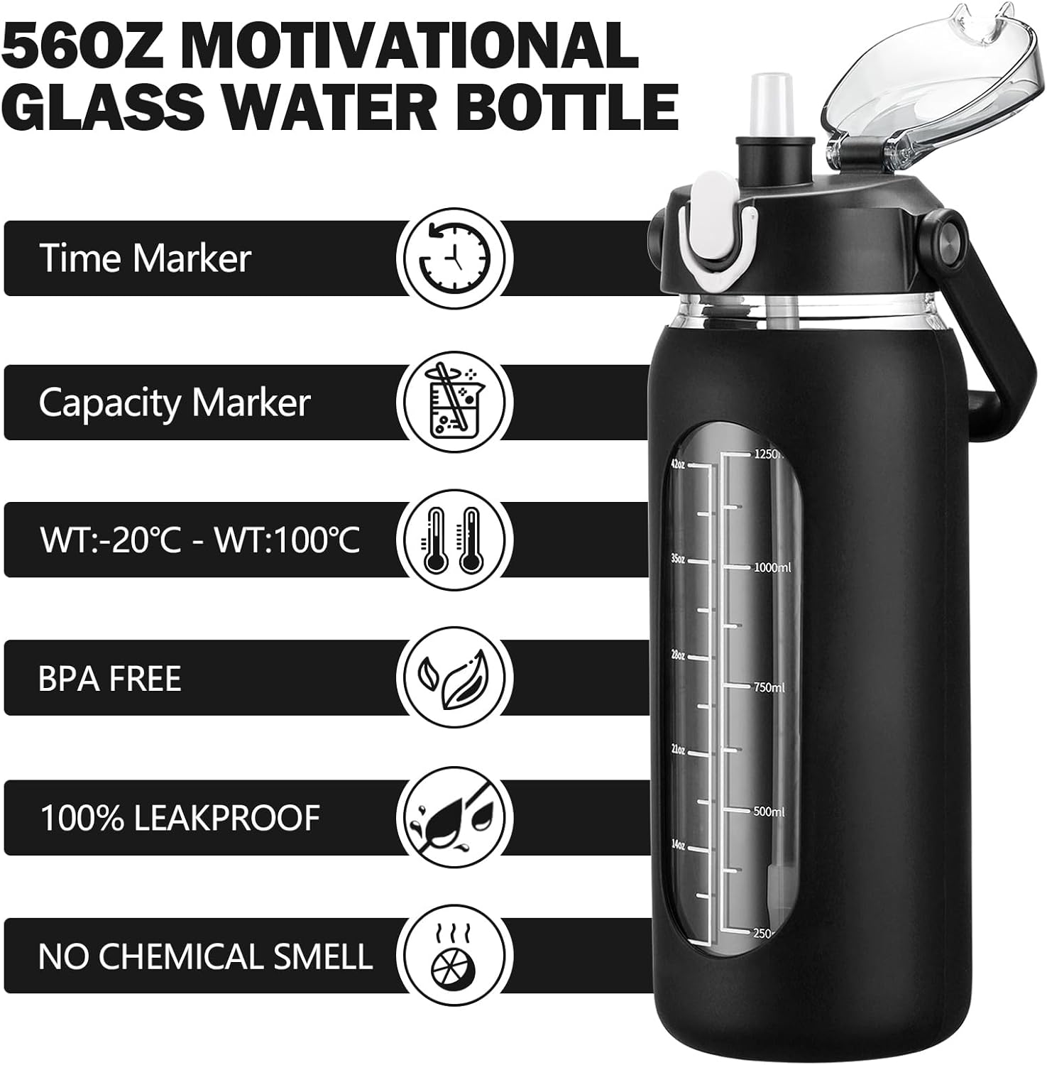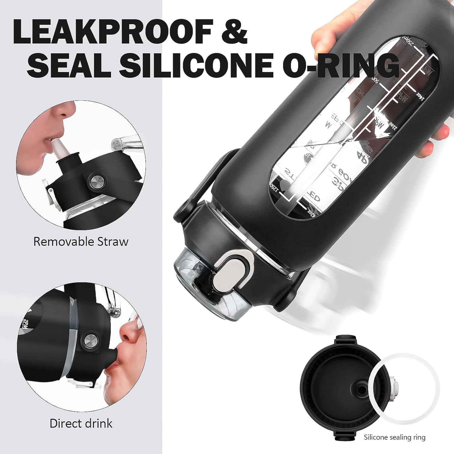 - ❤High-Quality Borosilicate Glass Bottle- This large motivationla water bottle is made of odorless, quality, borosilicate glass. Straw and lid are made of food-grade PP, BPA-free and eco-friendly.