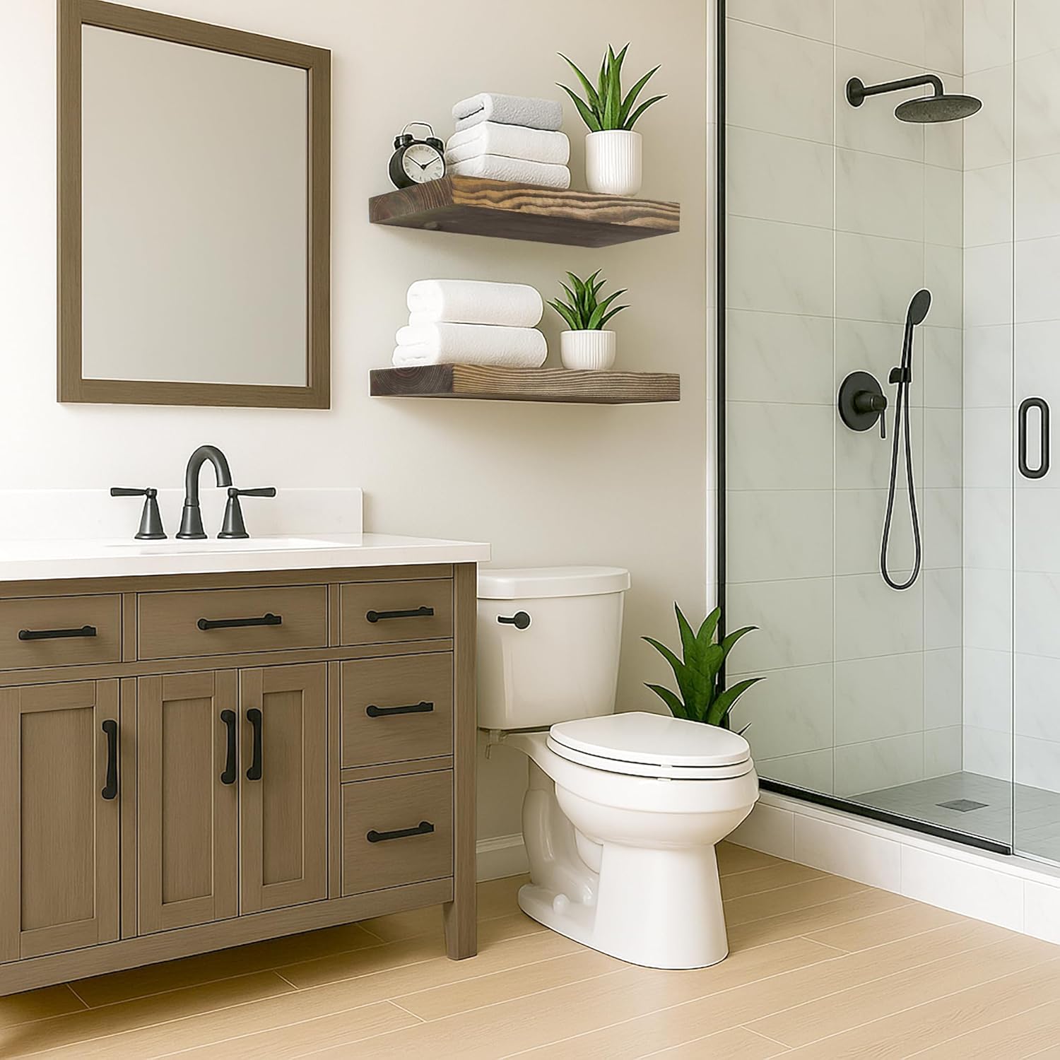 - Rustic Elegance: Embrace the timeless appeal of rustic design. Crafted from high-quality materials, our floating shelf showcases a natural wood grain finish that complements various decor styles, adding a touch of warmth to your surrounding.Its compact design allows you to free up valuable counter or floor space, making it perfect for smaller areas like bathrooms, kitchens, and more.