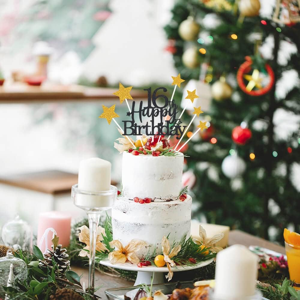 Glittery 16th Happy Birthday Cake Topper with Star,Personalised 16 Birthday Cake Toppers Party Decorations Party Supplies for Boys Girls Black Gold