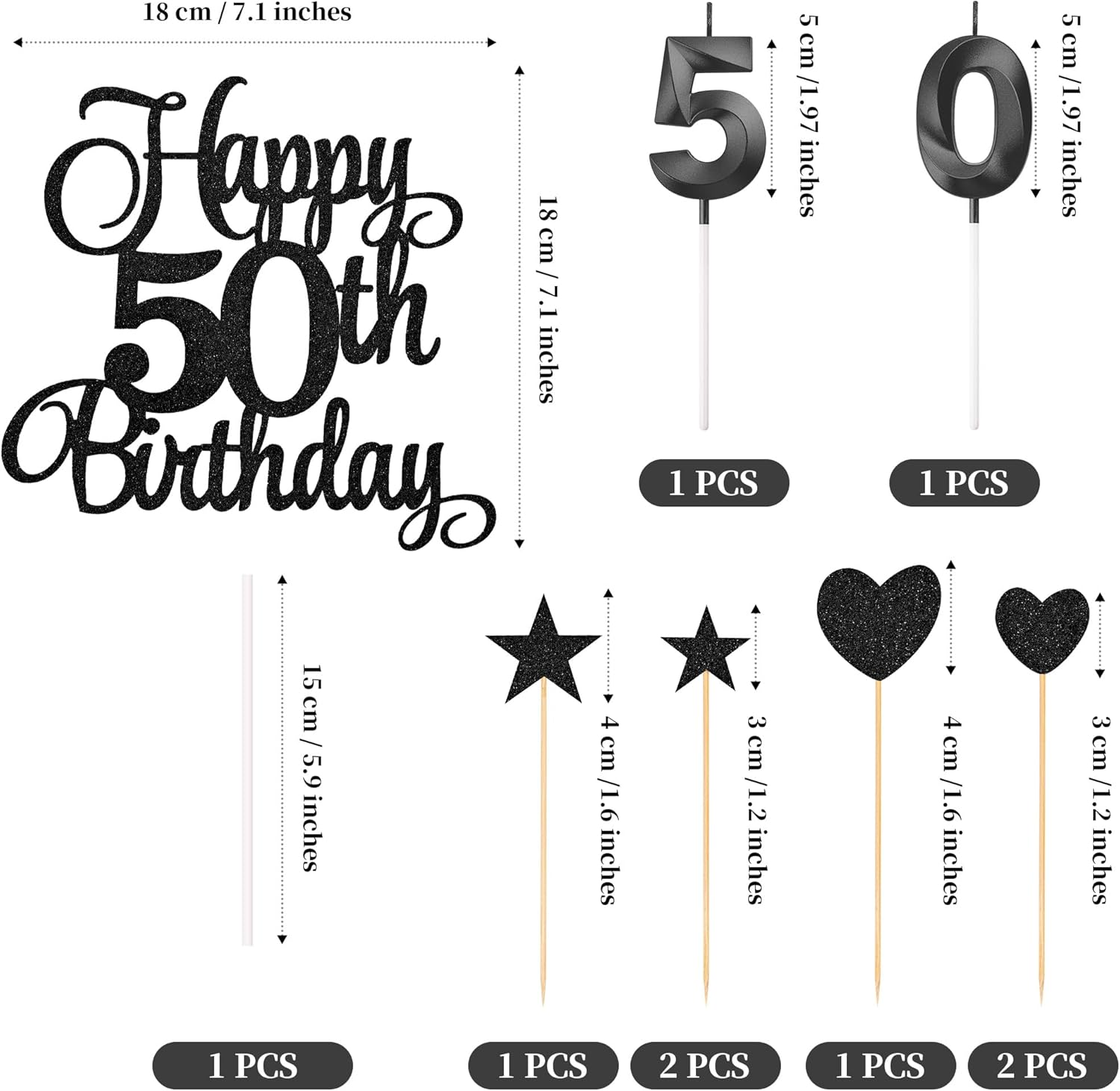 - Package content: you will receive 1 piece happy 50th birthday topper, 3 pieces star cake toppers, 3 pieces heart cake toppers and 2 pieces numeral candles, it's a great addition to the 50th birthday party and anniversary party