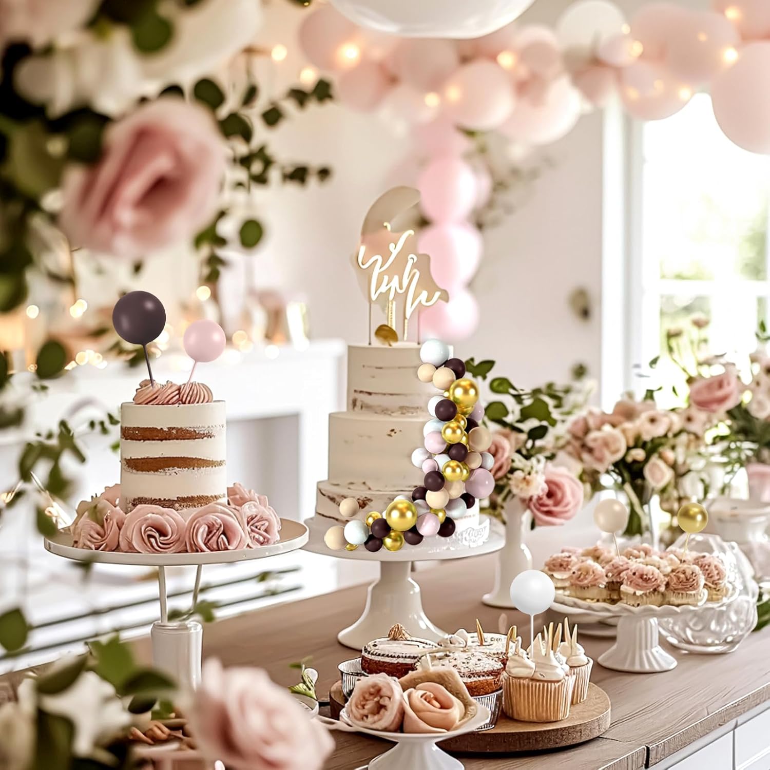 48 Pcs Balls Cake Topper Decorations Balloon Cupcake Toppers Foam Cake Topper Balls for Birthday Party Wedding Cake Decorating(Brown,White,Gold)
