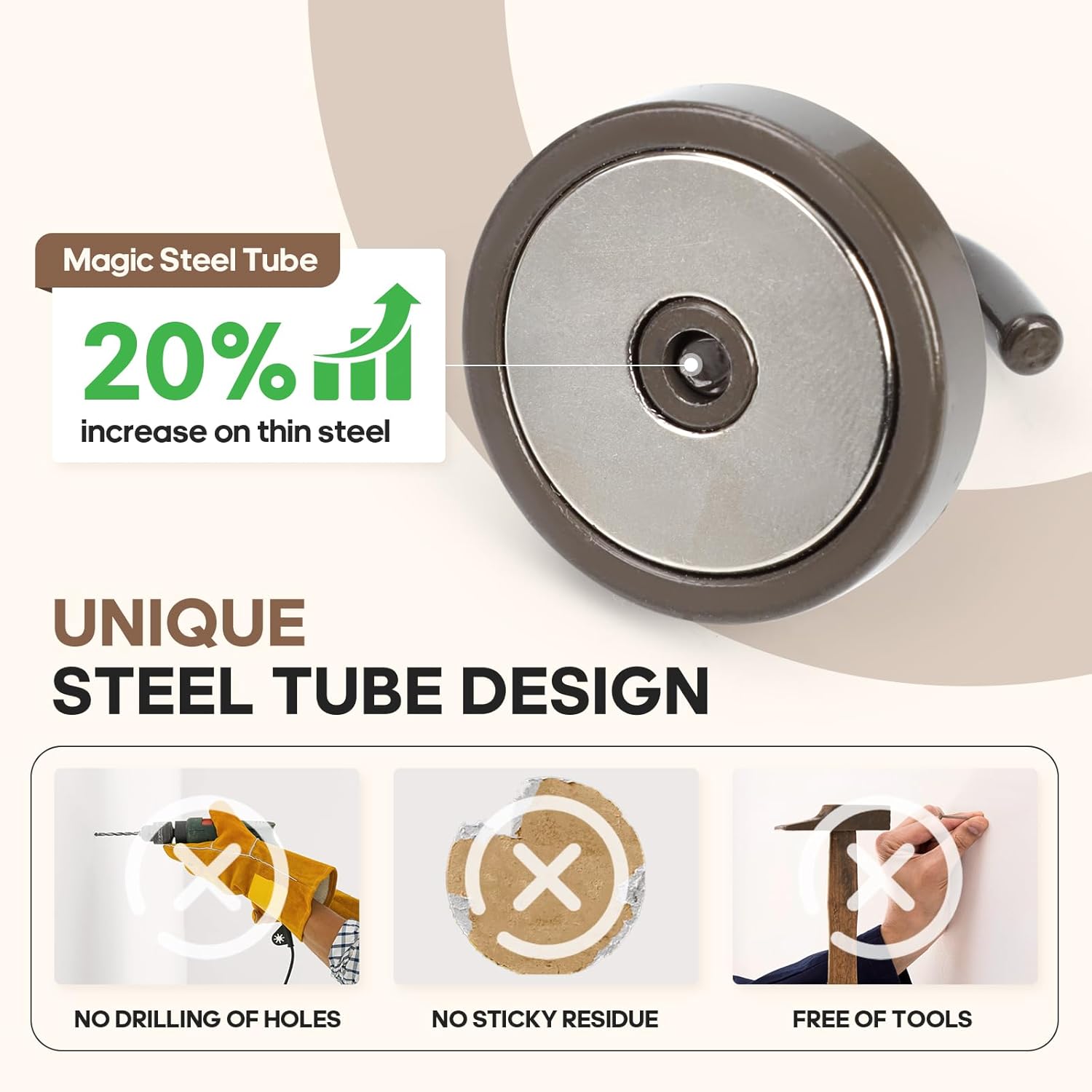 - ✔MAGIC STEEL TUBE DESIGN - Unique design of steel tube inside the base of magnetic hooks greatly increases the attractive force , especially on thin steel! It increase approximately 20% force comparing those none-tube magnets. it solves the problem of weak force on thin steel. Permanent magnetic hook with magic steel tube, strong magnetism lasts forever!