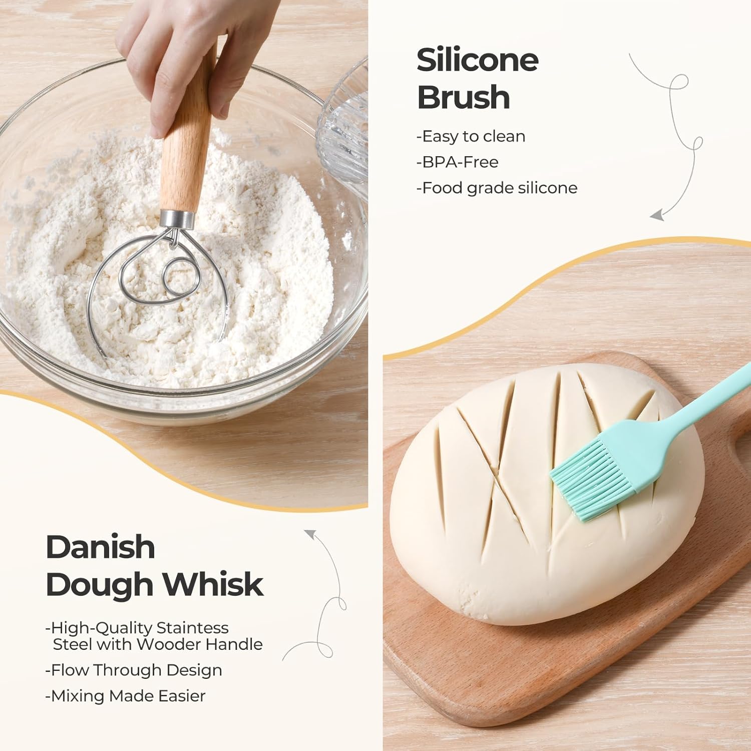 - Comprehensive Baking Kit: Our set includes everything you need for successful sourdough bread baking. The kit contains two silicone banneton bread proofing baskets—one round and one oval—along with a silicone brush for buttering, a sturdy dough scraper, a precision bread lame and dough scoring knife for scoring, and a Danish dough whisk for mixing. This all-in-one package simplifies your baking process and eliminates the need for additional purchases