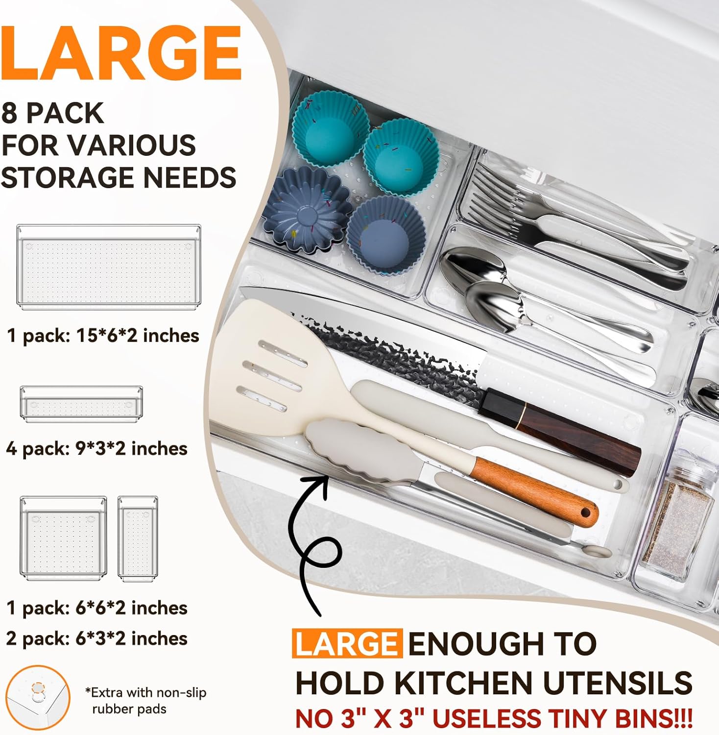 - γππΌπππ ππππ πππ ππππ πππππππγWith 4 sizes from extra large to small, this 8 set desk drawer organizer could meet all drawer organization and storage needs for kitchen utensils, silverware, kitchen gadgets, bathroom essentials, makeup accessoires or office supplies. Includes: 1pcs 15x6x2 inches, 1 pack 6x6x2, 2 pack 6x3x2, 4 pack 9*3x2.