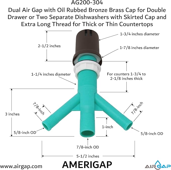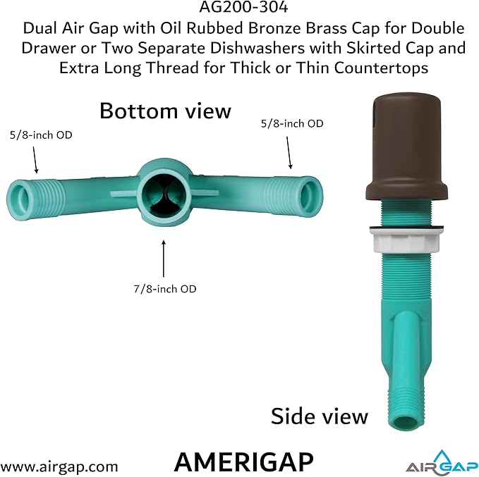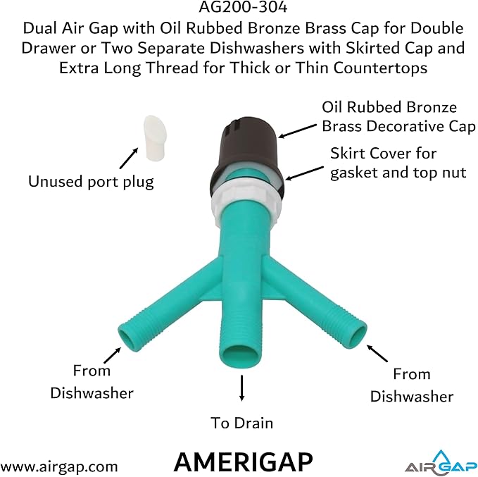 Dual Air Gap with Oil Rubbed Bronze Brass Cap for Double Drawer or Two Separate Dishwashers with Skirted Cap and Extra Long Thread for Thick or Thin Countertops (AG200-304, AG200-X04, AMERIGAP)