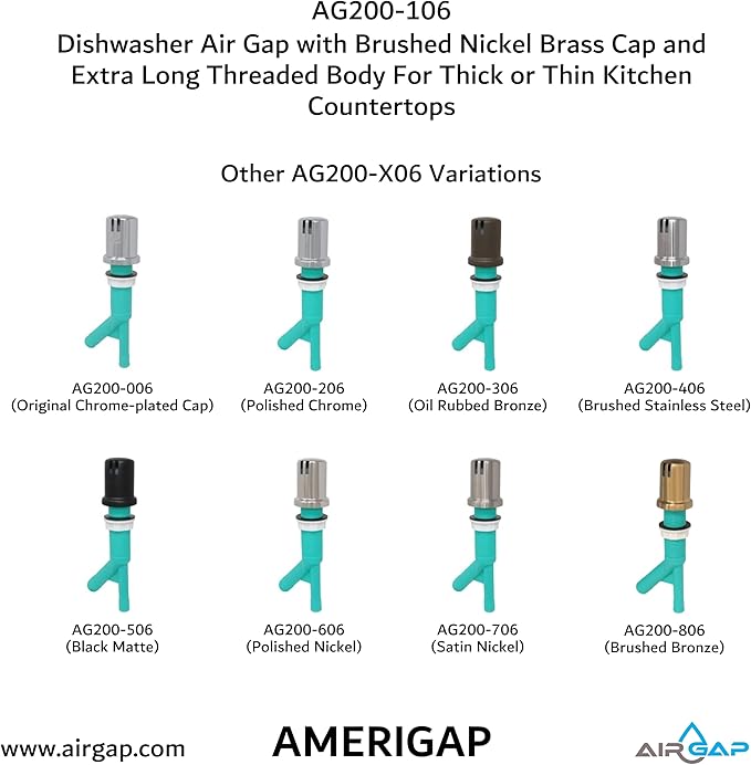- ❤ DECORATIVE CAP: The AG200-106 comes with a brushed nickel brass cap. The AG200-X06 offers a variety of decorative cap finishes designed to complement your kitchen sink faucet. Choose the air gap variation that best matches the color of your faucet.
