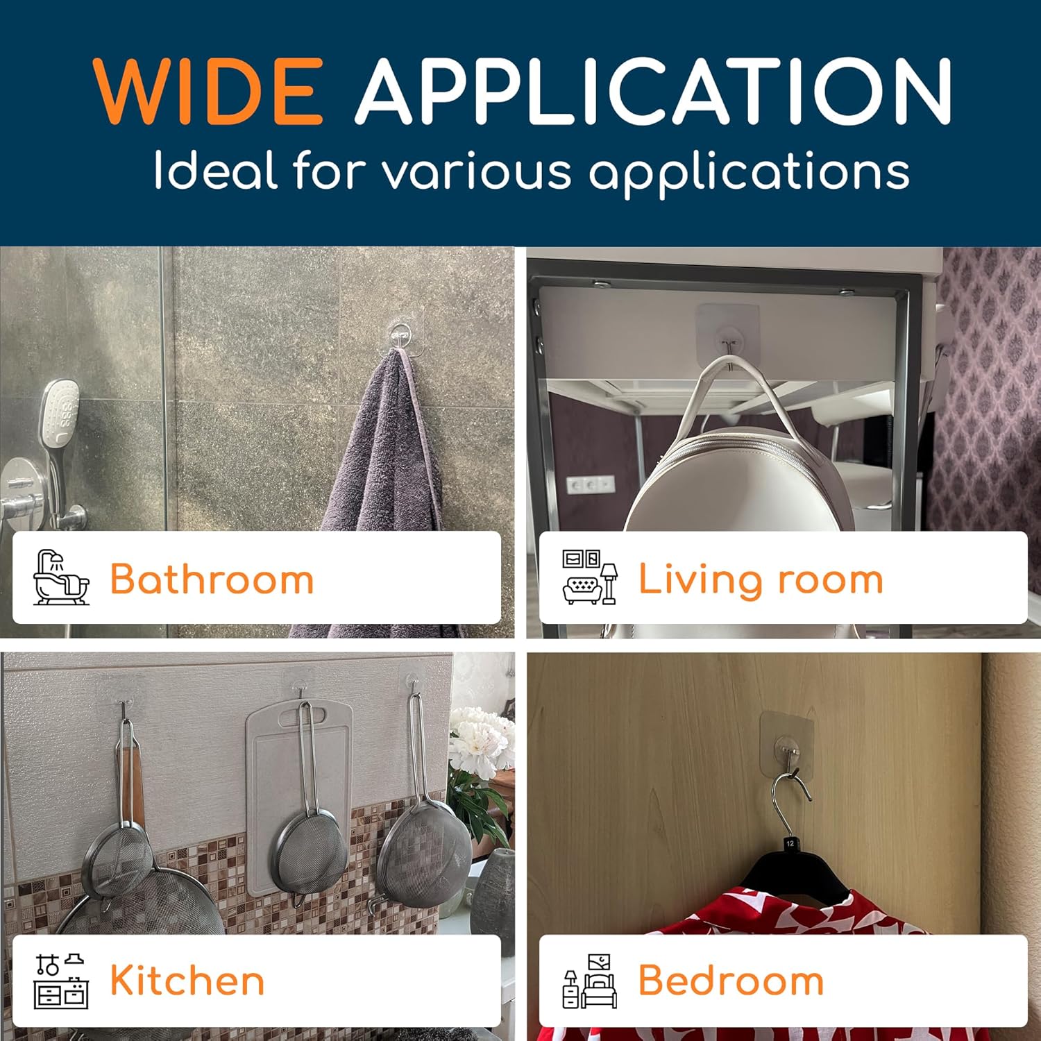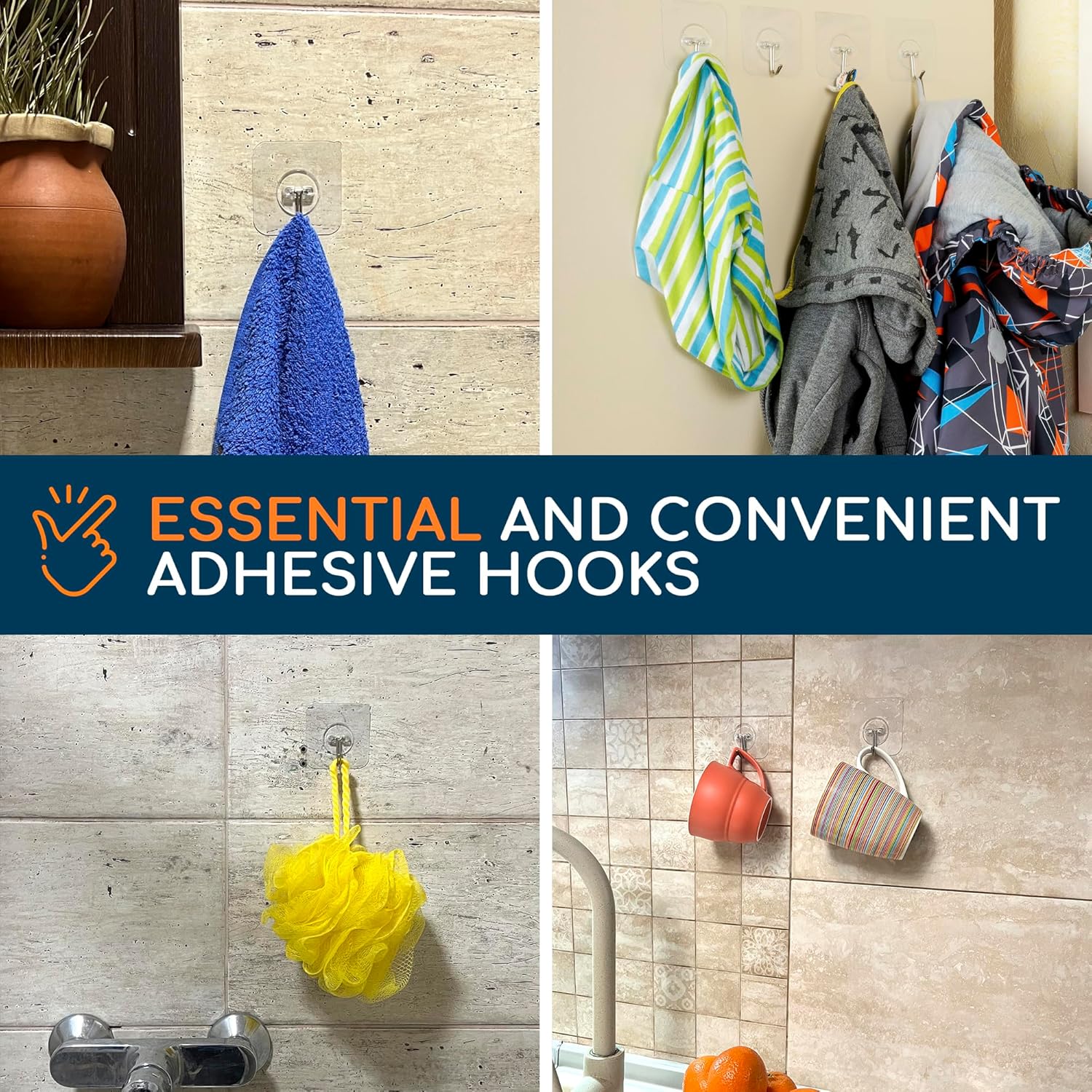 - Easy to use: Apply clear adhesive hooks effortlessly to clean and reposition without damaging surfaces; no nailing or drilling required; reuse after cleaning and drying; keep accessories secure on any surface.