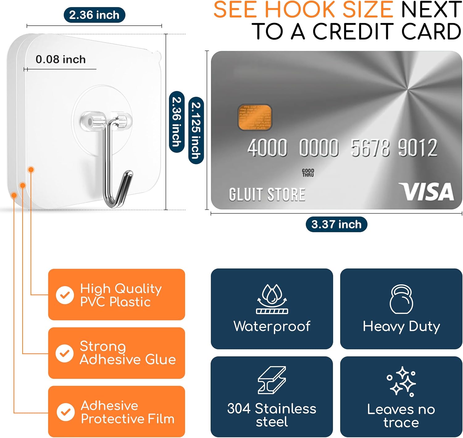 - Premium materials: Adhesive hooks crafted from robust stainless steel and durable PVC; high quality and longevity; remain clean and unaffected by time; non-toxic, recyclable, and transparent.