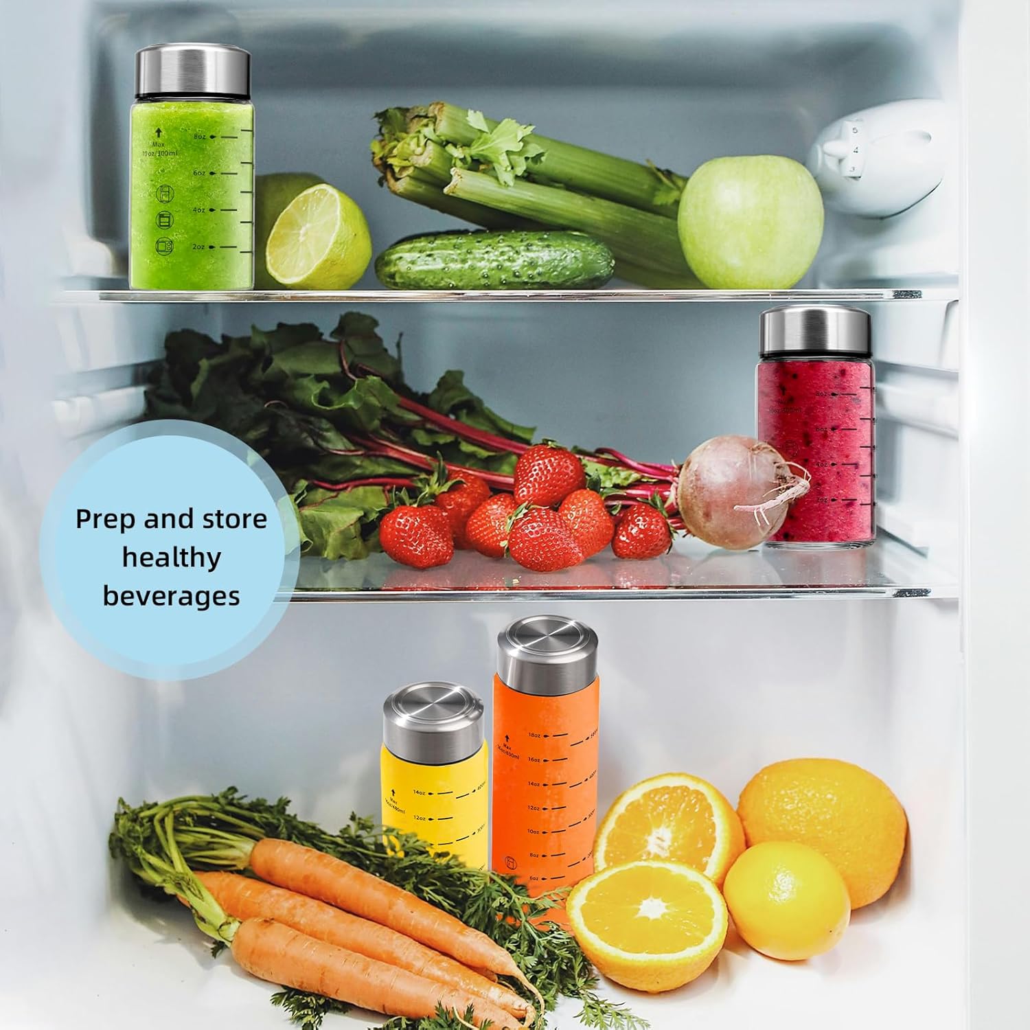 - [WIDE MOUTH & MEASUREMENT MARKINGS] With wide mouths and convenient measurement markings, our glass juice bottles are perfectly designed for pouring and storing healthy smoothies, juices, proten, ultra thick smoothies, frozen shakes & ice cubes.these bottles offer unmatched versatility and convenience.
