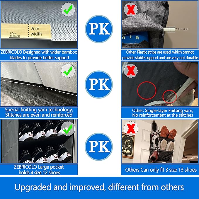 - 【New upgraded bamboo material】Bamboo has the function of enhancing air freshness and strong air permeability. We embed a piece of bamboo board in each layer of baffles, and also fix the shoe organizer, so that the whole is stable and does not deform. ultra strong, 10 Tier door shoe organizer can hold up to 70 pounds of weight; designed for long lasting use, features durable non woven fabric and thick rip and tear resistant stitching,and the overall construction feels sturdy and well-made