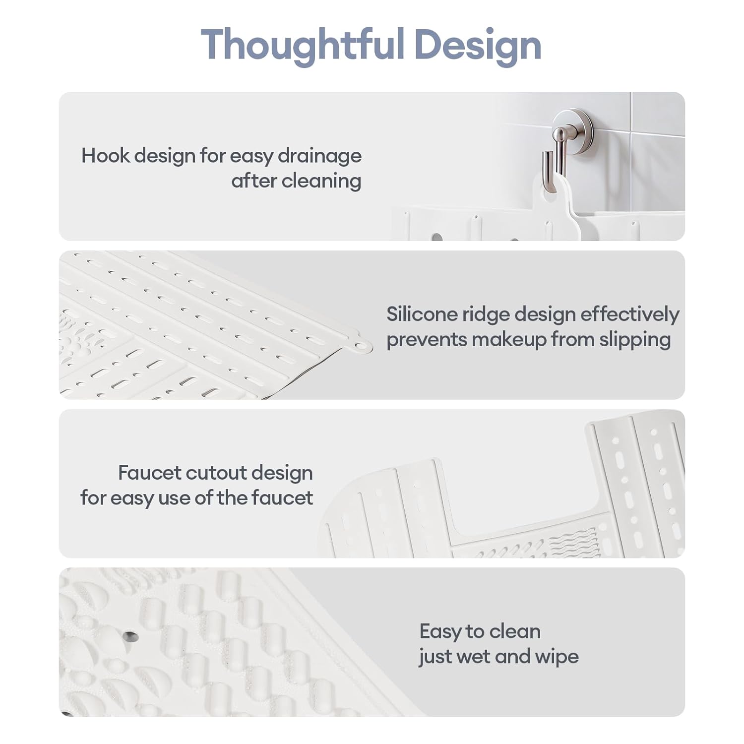 - Easy to clean and easy to use: Our bathroom sink mat has 3 different texture designs on the brush washing area, which effectively helps you remove makeup residue with different brushes, clean without hurting the bristles, and wash and dry in one. It is easy to wipe clean and towel dry after use to prevent water spots, and it dries quickly.