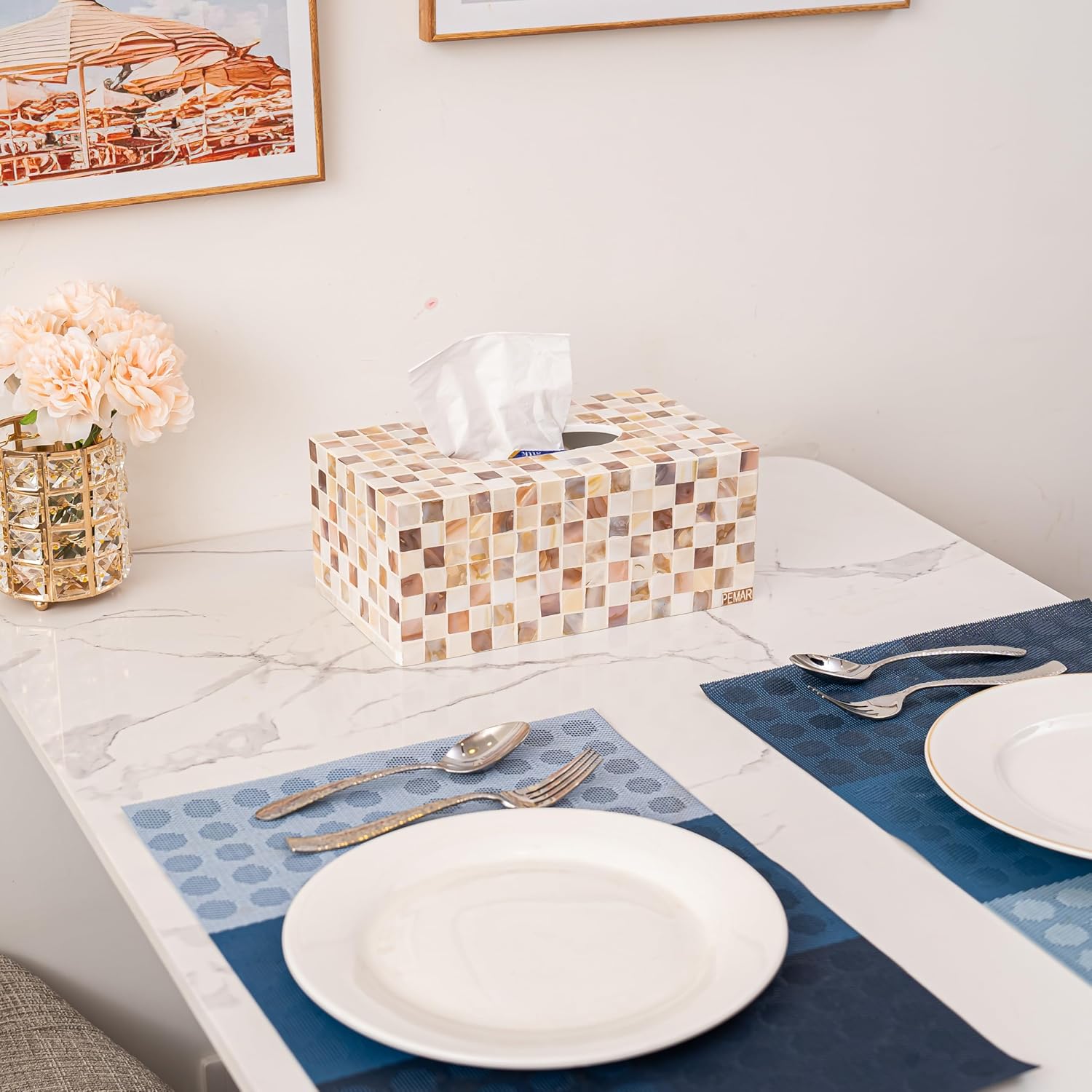- [CLASSY DÉCOR TOUCH] PEMAR decorative rectangular tissue box cover makes a charming statement piece in your home space. With a pearly smooth nacre / capiz shell finish and elegant inlaying patterns, the tissue & napkin dispenser adds an elegant country touch to your bathroom vanity or kitchen counter. In replacement for the boring plastic tissue box that you see everywhere, now you could hold your napkin or tissue box in a piece of art!