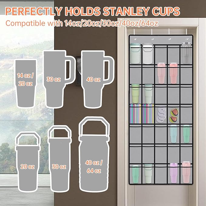 NiHome Multi-Functional 35 Pockets Door Hanging Organizer for Stanley Tumbler in Kitchen, Pantry, Bathroom, Large Capacity Elastic Mesh Secure Storage Water Bottle Cup Holder, Foldable for Home (Gray)