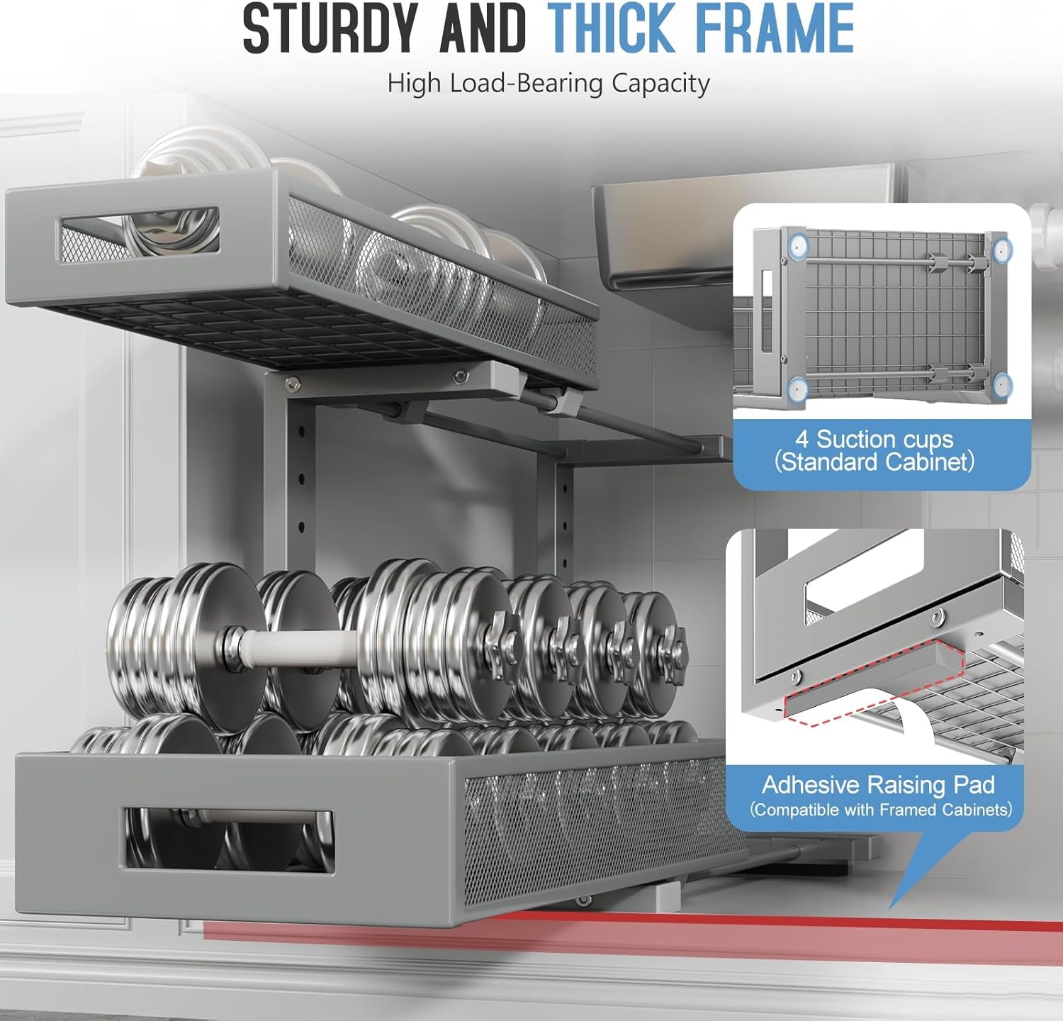- 【2-Tier Pull-Out Design for Easy Access】This under-sink organizer features a double-layer pull-out design, allowing you to easily access items at the deepest part. The upgraded, thickened iron circular sliding rails ensure a smooth and seamless pulling experience, making each use effortless. The unique pull-out locking mechanism effectively prevents the drawers from being completely pulled out, avoiding the risk of items falling or structural damage caused by over-pulling, ensuring safer