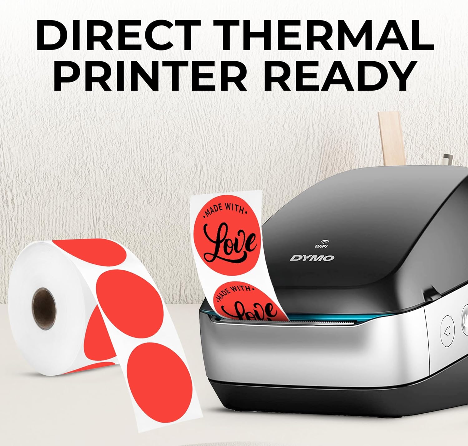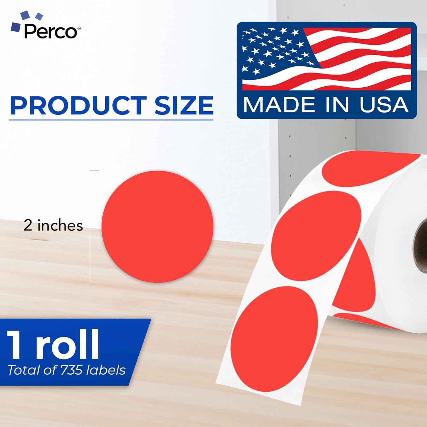 Perco Red 2-Inch Perforated Circle Dot Thermal Sticker Labels — 735 Stickers/Roll, Direct Thermal Printer Compatible—with Permanent Adhesive for Organizing, Color Coding, Bin Labeling—Made in USA