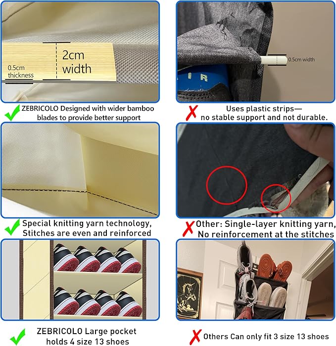 - Fit Size 13 Boots or 2 Sneakers – End shoe Tetris struggles! shoe organizer, Each extra-deep pocket (10.63"D x 17"W) swallows bulky footwear, gym gear, or travel essentials. shoe organizer, Reinforced with high-density tear- high-tensile nylon (commercial-grade fabric!) and X-stitch seams that laugh at daily wear.over the door shoe organizer, Perfect for garages, RVs, dorms – anywhere life gets messy.