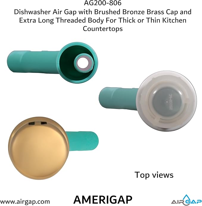 Dishwasher Air Gap with Skirted Brushed Bronze Brass Cap and Extra Long Threaded Body for Thick or Thin Kitchen Countertops (AG200-806, AG200-X06, AMERIGAP)