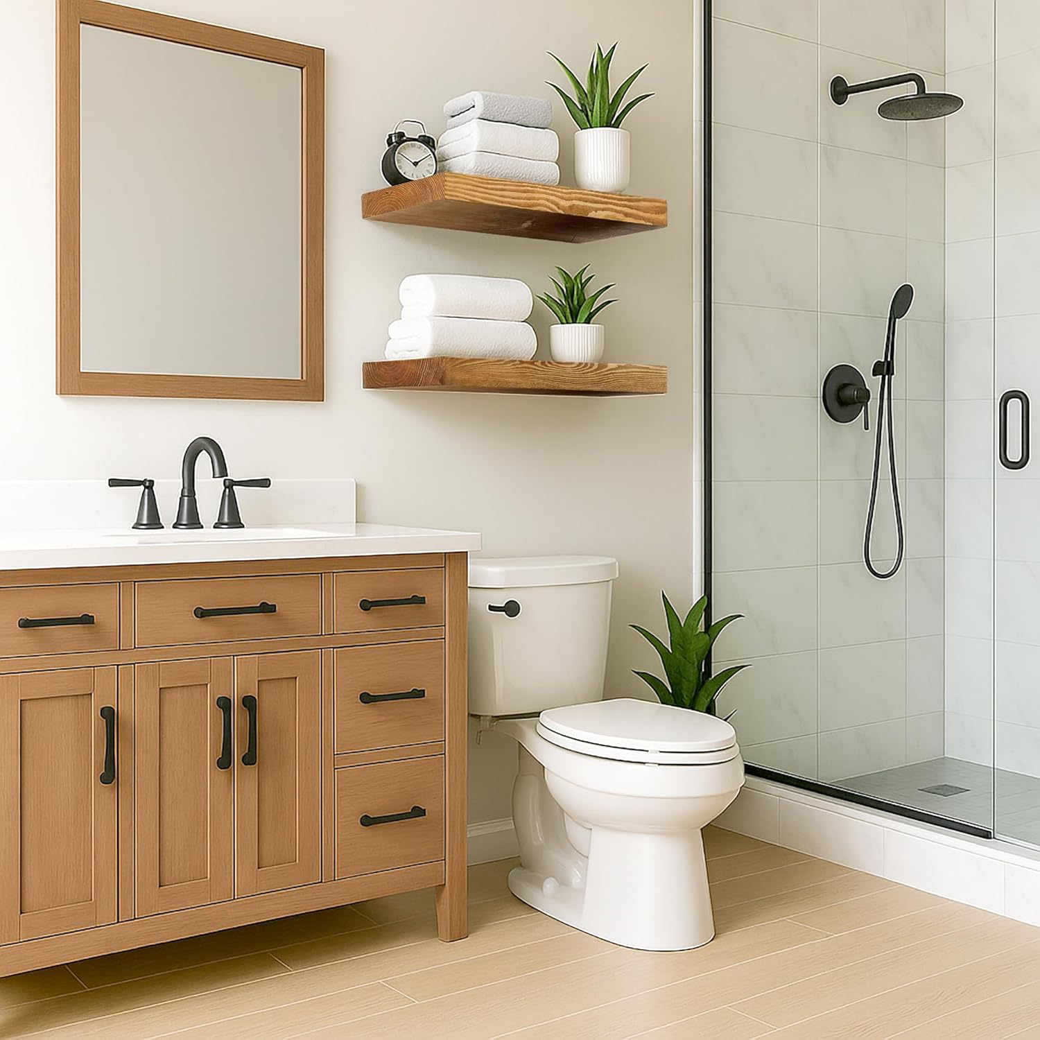 - Rustic Elegance: Embrace the timeless appeal of rustic design. Crafted from high-quality materials, our floating shelf showcases a natural wood grain finish that complements various decor styles, adding a touch of warmth to your surrounding.Its compact design allows you to free up valuable counter or floor space, making it perfect for smaller areas like bathrooms, kitchens, and more.