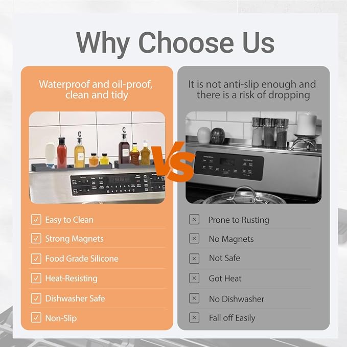 - 【Safe & Durable Design】Made from premium silicone, this stovetop shelf stays cool to the touch and protects your spices from heat damage. Unlike metal racks, it won’t rust, warp, or stain, ensuring long-lasting use. Plus, it’s dishwasher-safe for quick and easy cleaning.