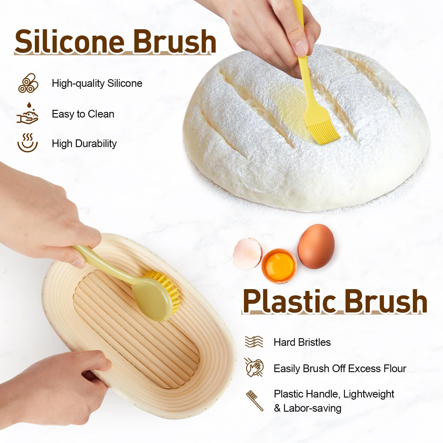 - [Effortless to Use and Maintain] Simply dust the proofing basket with flour, rest your dough, and watch it rise into a uniform loaf with a beautiful spiral—no sticking, no flattening. Achieve a chewy interior and crispy crust, just like bread made by a skilled baker. After baking, the included brush sweeps excess flour from the rattan grooves in seconds. For best results, avoid washing with water and keep out of direct sunlight.