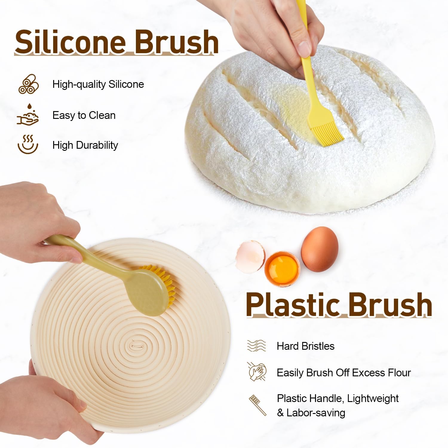 - [Effortless to Use and Maintain] Simply dust the proofing basket with flour, rest your dough, and watch it rise into a uniform loaf with a beautiful spiral—no sticking, no flattening. Achieve a chewy interior and crispy crust, just like bread made by a skilled baker. After baking, the included brush sweeps excess flour from the rattan grooves in seconds. For best results, avoid washing with water and keep out of direct sunlight.