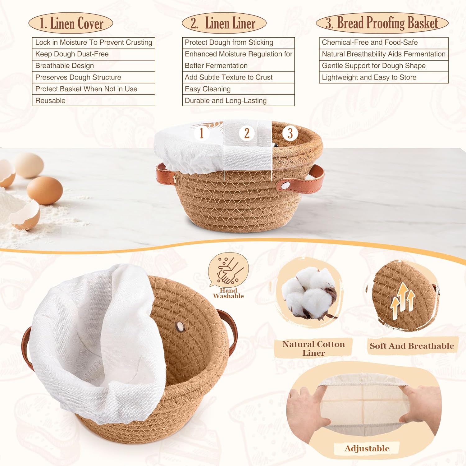 - 🌾100% NATURAL COTTON ROPE BREAD PROOFING BASKET FOR SAFE BAKING - Our premium bread proofing baskets are crafted from high-quality cotton rope, non-toxic, BPA-free, and free from harmful chemicals, ensuring complete safety for food contact. Round Sourdough Proofing Basket (5 Inch) X 3, Oval Bread Basket (7 Inch) X 3, Linen Cover X 6, Linen Liner X 6. The included all-natural linen liner provides a completely chemical-free, non-stick surface for consistently perfect loaves. Just unbox and start restaurant-quality sourdough bread made simple in your own kitchen!