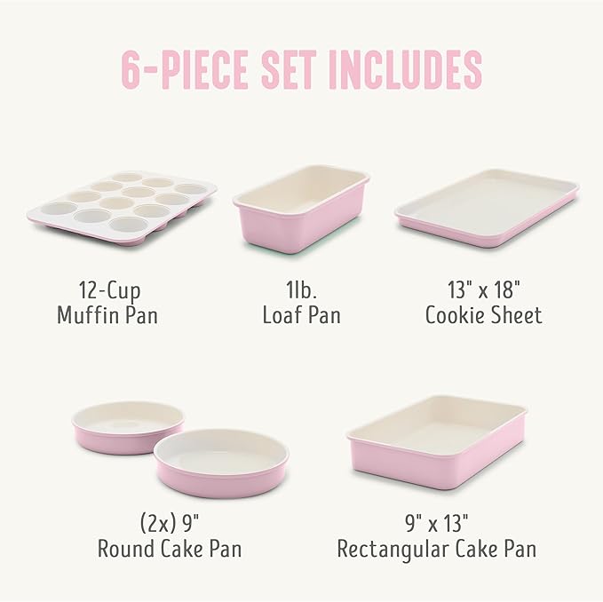 GreenLife 6 Piece Nonstick Bakeware Set, Non-Toxic PFAS-Free Ceramic Oven Pans, Dishwasher & Oven Safe to 450°F, Easy Release Baking Sheet, Loaf Pan, Rectangle & Round Cake, Muffin Pan, Pink