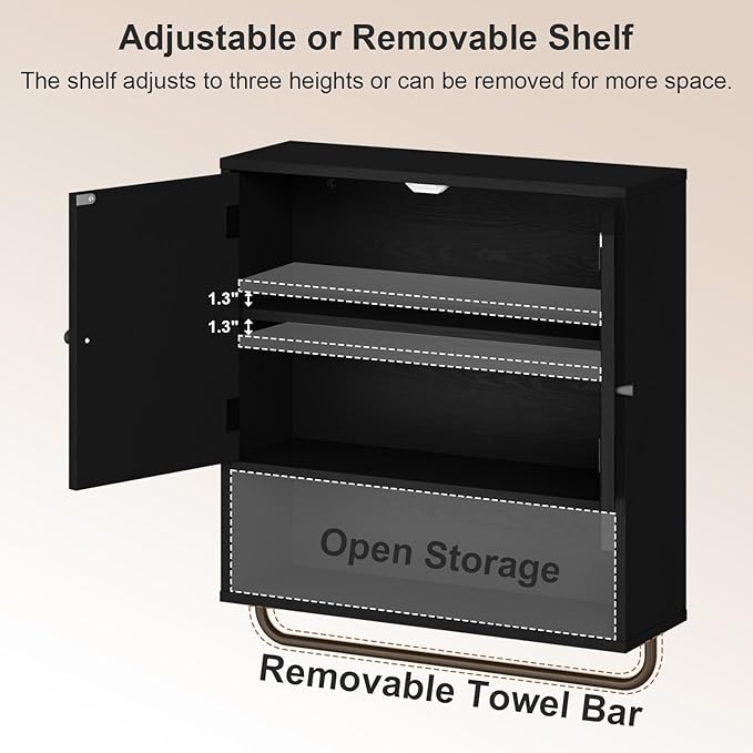 - Smart Storage with Adjustable Features-Includes an adjustable interior shelf, open lower shelf, removable towel bar—ideal for organizing toiletries, towels, kitchen items, or small decor. Maximize your wall space and keep essentials within easy reach. Designed to fit above the toilet or on narrow walls, this bathroom wall shelves saves floor space while offering generous storage.