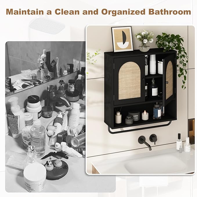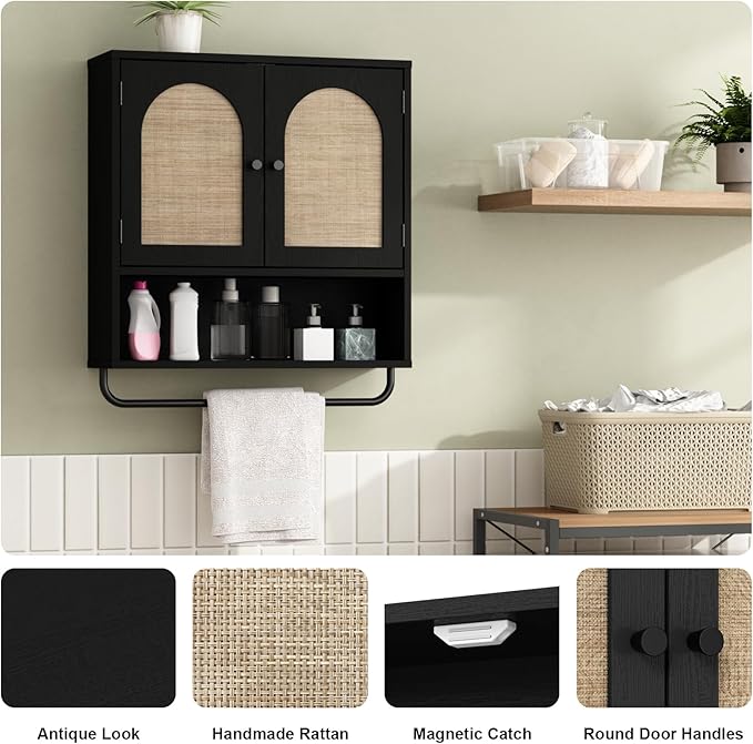 - Rustic & Stylish Design-Upgrade your space with this beautifully crafted woodgrain black medicine cabinets, featuring arched rattan doors and black knobs—a perfect fusion of organic texture and modern design. Whether in the bathroom, kitchen, living room, or laundry area, this wall storage blends bohemian warmth with art deco elegance, turning simple storage into a statement.