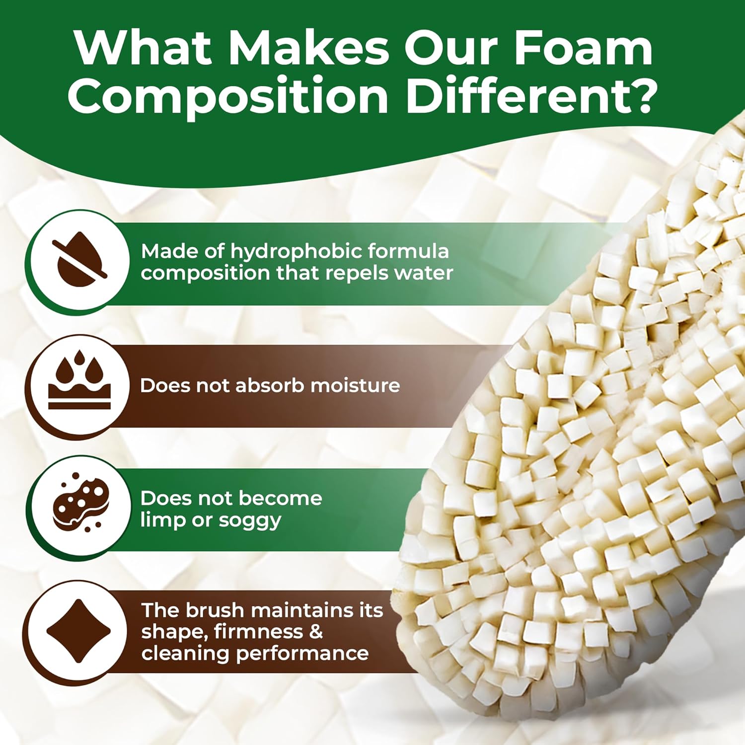 - INNOVATIVE FOAM COMPOSITION - Unlike sponges that absorb water, this glass scrubber brush is made of hydrophobic formula composition that repels water, ensuring the brush does not absorb moisture, become limp or soggy, the brush maintains its shape, firmness and cleaning performance even during your biggest clearing job
