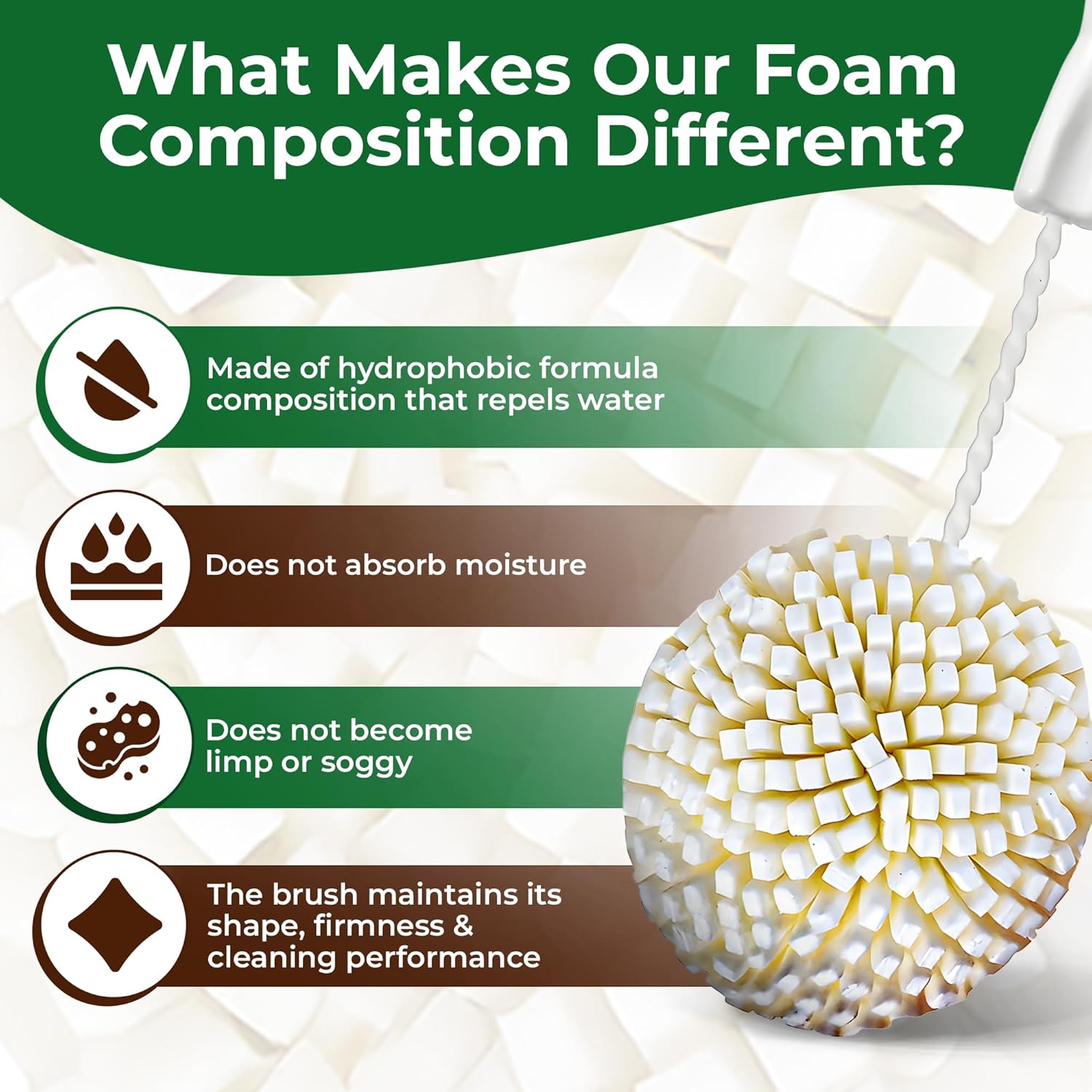 - INNOVATIVE FOAM COMPOSITION - Unlike sponges that absorb water, this glass scrubber brush is made of hydrophobic formula composition that repels water, ensuring the brush does not absorb moisture, become limp or soggy, the brush maintains its shape, firmness and cleaning performance even during your biggest clearing job