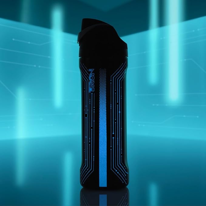 - 24-ounce insulated stainless steel water bottle with a FreeSip spout and push-button lid with lock; special TRON edition glows in the dark