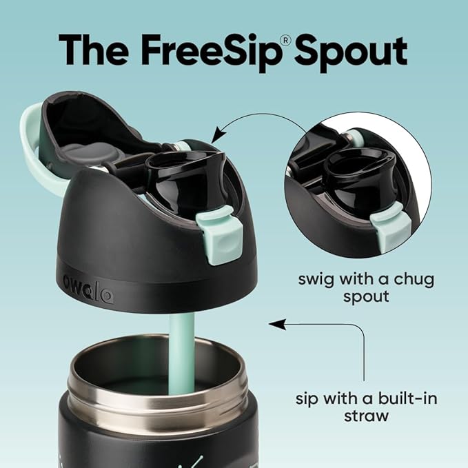 - Patented FreeSip spout designed for either sipping upright through the built-in straw or tilting back to swig from the spout opening