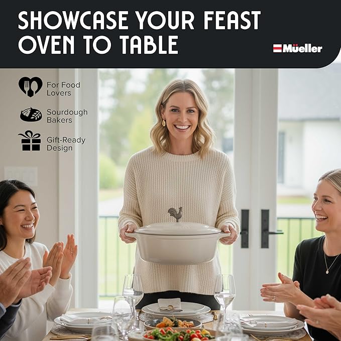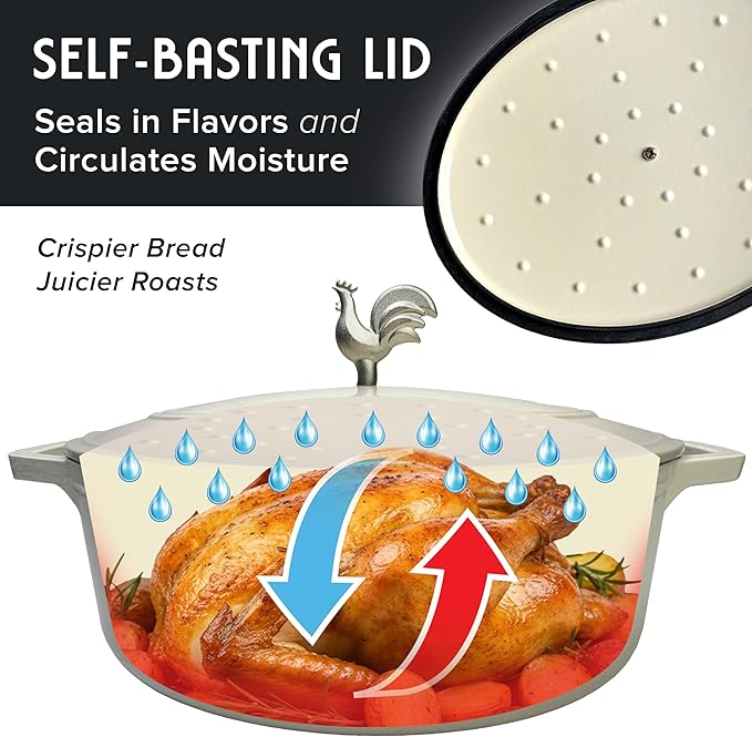 MUELLER HOME 5.5 Quart Enameled Cast Iron Oval Dutch Oven with Rooster Knob & Cotton Potholders, Heavy-Duty Cookware, Oven-Safe up to 500° F & Across All Cooktops, Gifts for Grandma & Women, White