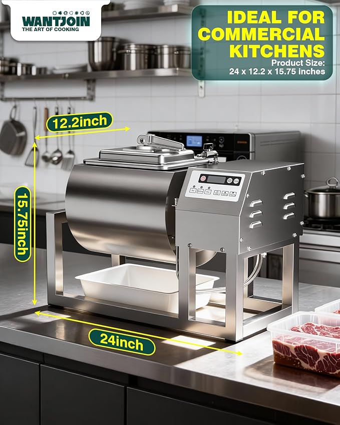 - 30MIN FAST & EVEN MARINATION: Using upgraded 80W copper motor, -70Kpa vacuum pressure and dual-direction rotation, this vacuum marinator tumbler opens up meat fibers for fast, even marinade flavor absorption. It completes full marination in just 30 minutes—perfect for busy commercial kitchens that need speed and consistency without compromising on taste