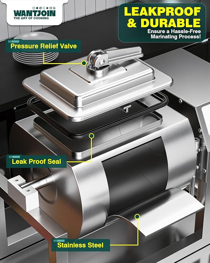 - DURABLE & LEAKPROOF: The upgraded durable 80W copper motor and high-quality stainless steel body ensures reliable performance and longevity. Built for long-term use, this vacuum marinator features a sealed lid with handle, anti-leak gasket, and internal pressure relief valve to prevent deformation or spills during 360° rotation
