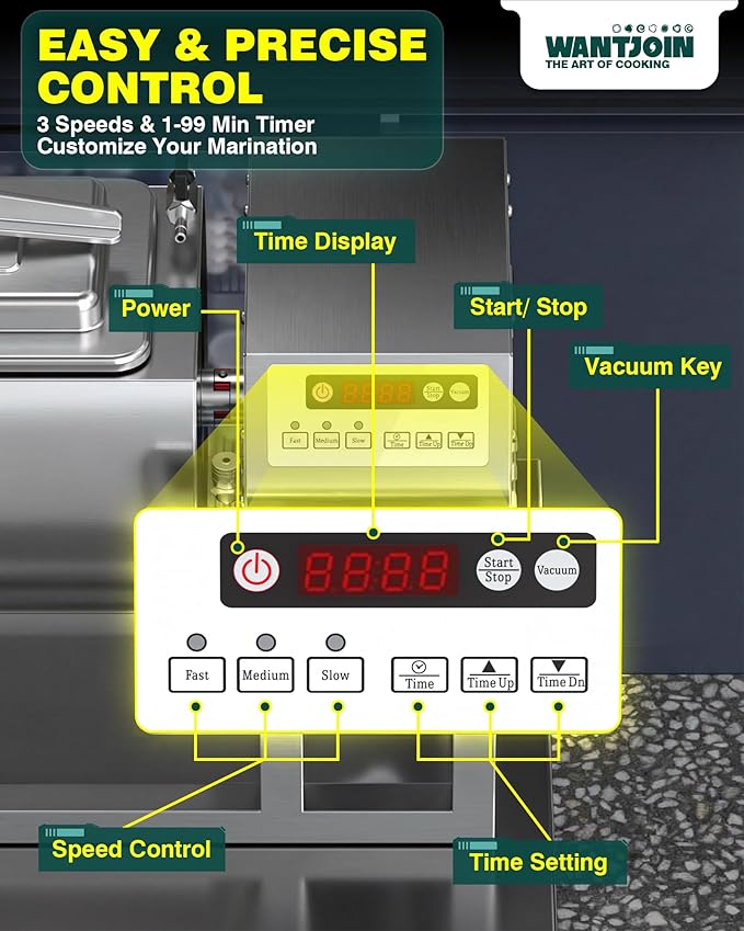 - SMART & EASY OPERATION: Equipped with a user-friendly digital panel, this vacuum marinator tumbler offers 3 speeds (high/medium/low) and precise timer settings (1–99 minutes). Whether you're a seasoned chef or a kitchen beginner, it lets you fully customize your marination process with ease and control
